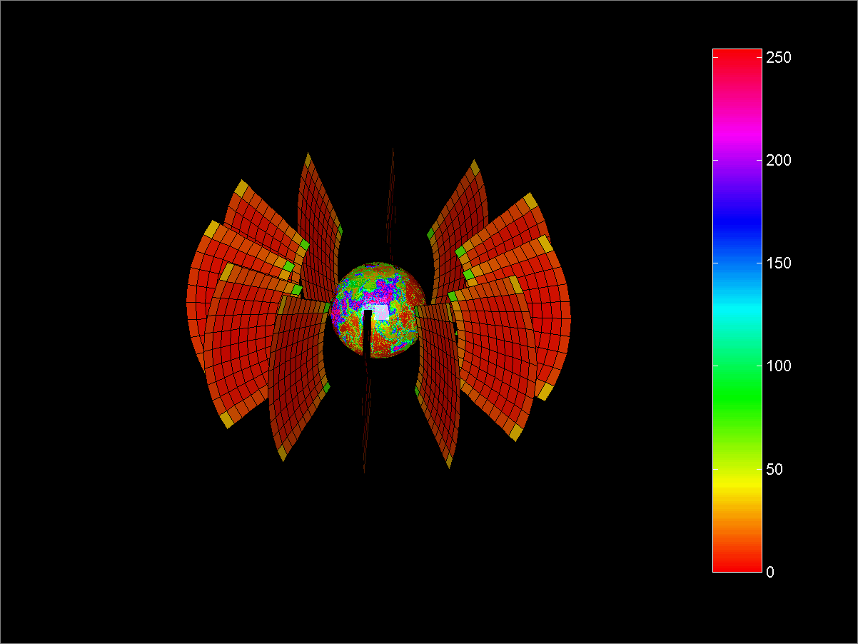 As a debris object orbits the earth, it also rotates, and as it does so, it reflects sunlight.  Usually these objects are too far away and/or too small to resolve in a telescope, but telescopes can be used to measure the total amount of sunlight received at the telescope aperture versus time. This is known as a light curve. Dr. Ojakangas’ most recent work for the JSC orbital debris program involved simulating the light curves for various laser-scanned and other model debris objects as they rotate in outer space.  The graphic on the left (top) shows the diffuse (red) and specular (i.e. mirror-like, yellow) light curves for a “flake-like” fragment, simulated in Matlab. Unit quaternions are four-dimensional complex numbers that lie on the surface of a 4D sphere, each point of which represents a unique orientation.  The three-dimensional projection of all of these orientations is a solid sphere(lower right). For a given solar phase angle, the graphic on the lower right shows all possible orientations, color-coded by their brightness.  The yellow curve is a trajectory of orientations for the object as it rotates [source: Dr. Ojakangas under contract with NASA].